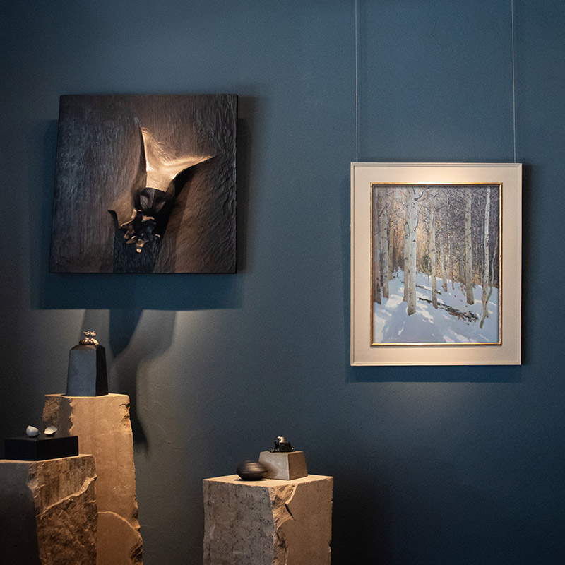 Presenting the sculptural work of Peregrine O'Gormley against John Taft's landscape paintings was a fun challenge. Both artists focus on naturalistic subjects in their own rights, so I opted for a pretty stark treatment all around for contrast.